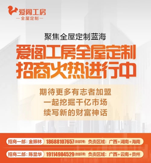 爱阁工房全屋定制成立于 2003 年,总部生产基地位于中国(广西)自由贸易试验区南宁市良庆区,建筑面积超 40000 ㎡,建立了 2000 ㎡的家居生活体验中心。爱阁工房深耕广西市场19年,全国拥有近百家直营和经销门店,覆盖广西多个主要城市,成功进驻贵州、云南、海南、湖南等地区,获得富安居、红星美凯龙、居然之家等全国知名卖场高度认可。未来,还将立足于广西,加速推进全国战略布局,为铸造全国较具竞争力品牌而不懈奋斗。