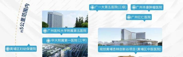 附近几所三甲医院中大附属第一医院(三甲),广医大附属第五医院(三甲)、黄埔区中医医院、广州市黄埔区妇幼保健院等,都在2公里之内。
