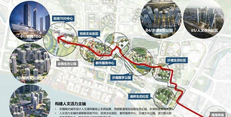 西至设施生态公园,东联南海神庙,构建串联TOD商业、文化街区、都市服务、生态社区等重点项目的漫游活力轴,重点塑造 “双岗TOD中心、都市服务中心”两大综合商业地标及“双岗、沙涌”两大休闲文化街区,目前双岗TOD中心已确认引入华润万象系商业运营。