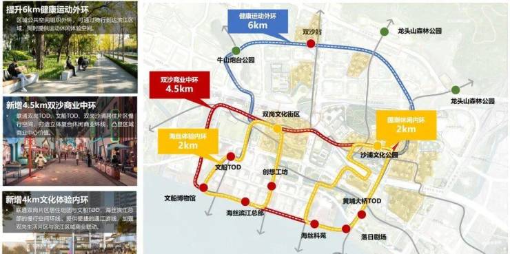 构建“两轴、一带、三廊、三环”的慢行系统网络,三环分别为 6公里运动外环连接滨江,4.5公里商业中环连接华润万象系TOD商业 ,4公里文化体验内环连接各重要空间。
