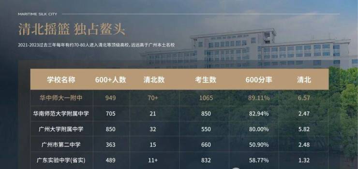 2021-2023年,华中师范大学第一附属中学每年都有约70-80人进入清北等国内顶级高校。这个数据很恐怖,拿广州神学院华附来说,每年进入清北20-30人,广东最牛的中学——深圳中学2023年进入清北的49人,广大附中也只有15人,差距比较明显!