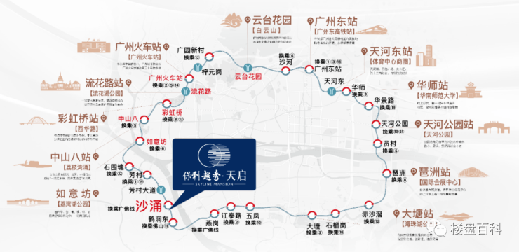 广州首条地铁环线11号线上盖,11号线共设立32个站点,19个换乘站,地铁不换乘,一线连全城,打造超级TOD都会环,横跨5大区一小时搞定!辐射2大枢纽(广州火车站、广州东站)及6大CBD(环市东、天河北、金融城、琶洲、白鹅潭、千灯湖),聚集海量人流,驱动澎湃消费力。