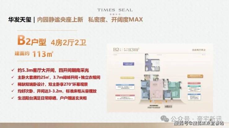 约110-114㎡四房两厅两卫:约16米通风面,户户是端户;约28㎡行政级端卧套房,270°景观视野,360°环统式采光