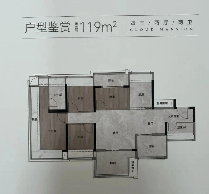 建面约106㎡四房空间更为舒展,南向双阳台设计兼顾景观观赏与日常家政使用