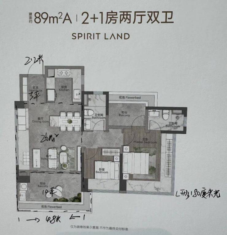 建面88平三房两卫,内外双玄关,LDKG一体化设计,约4.8米客厅开间,28平的大主套,带有270度全景飘窗,这个户型存在挺大的Bug的,北向次卧比较小,海贝隔壁户型挡住光线,总价375万起。