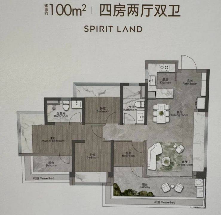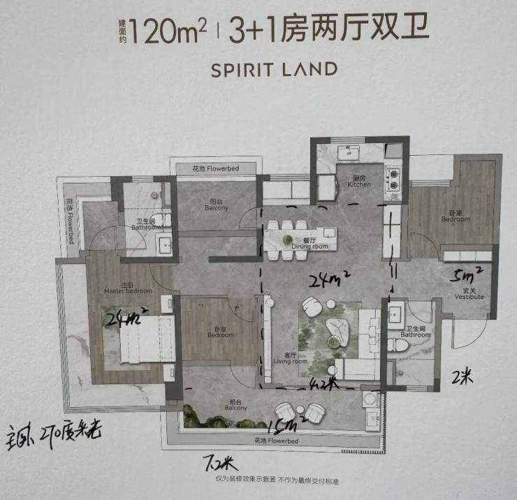 建面120平四房两卫,双玄关入户,28平的南北对了大方厅,约7米长阳台,23平的大主卧,独立衣帽间。