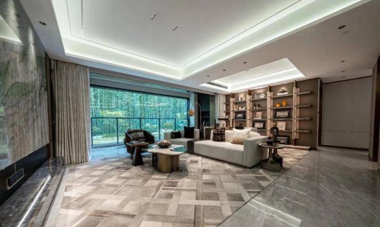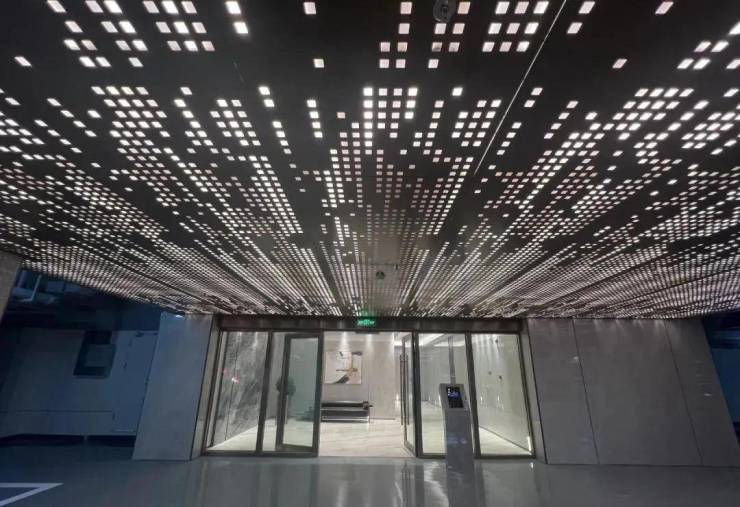 天汇五期做了双大堂的设计,负一层也有入户大堂,岩板的背景墙+金属包边,还有高端项目标配的星空顶。