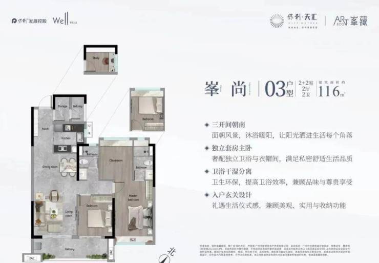 建面116平四房,三开间朝南,有南向,东向两个朝向,竖厅设计,独立玄关,干湿分离卫浴空间,2+2四房,约6米的景观阳台,主卧面积约18平,配置大飘窗,独立卫浴