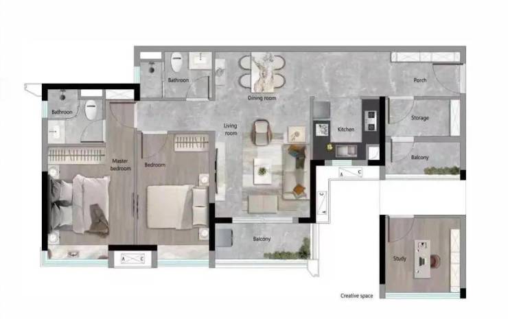 建面99平三房,一进门就是个书房,一半面积为赠送,主卧也是套房设计