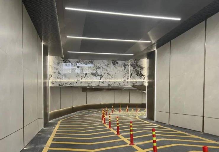 车库入口是酒店式的高度,从车库入口进入地下,通道宽敞亮堂,开车比较好开,转弯处做了岩板背景墙。
