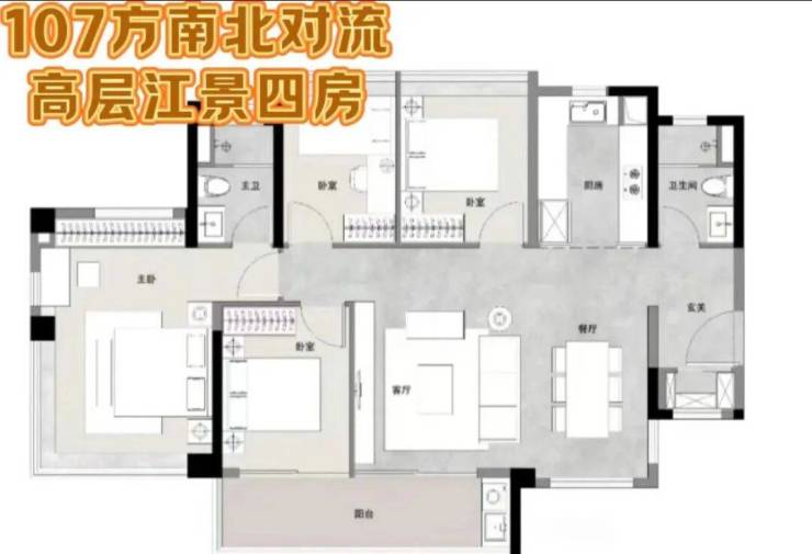 户型亮点:全南向设计,84㎡三房卧室均朝南,107㎡四房横厅+超大面宽;高实用率(阳台占比达20%),部分单元主卧270°飘窗瞰江。