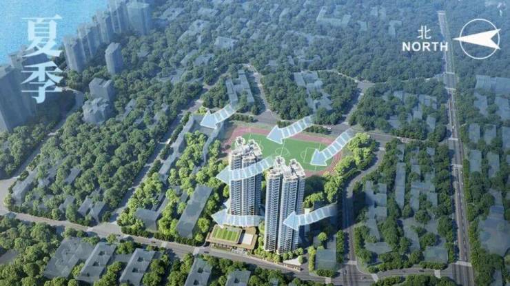 考虑到广州潮湿闷热和梅雨气候,和广州人更爱东南向阳光的特点,项目反复研磨楼栋的朝向偏转——让楼栋朝东南向扭转,2栋之间形成“峡谷”,实现户户全南向,尽可能做到全南向、大开间。