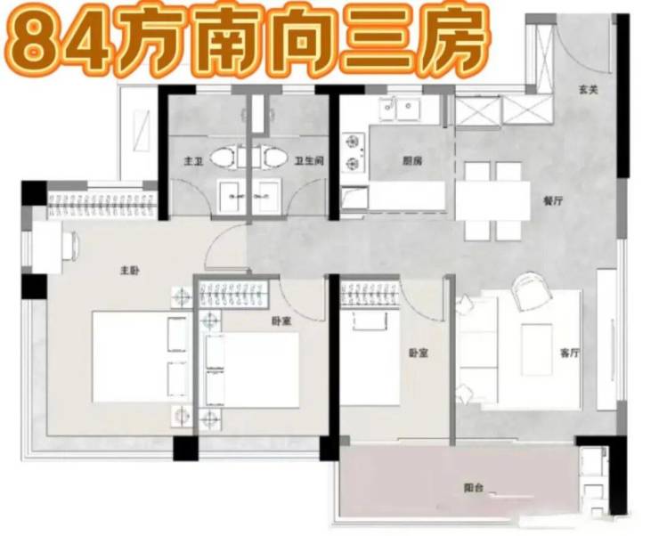 另外项目的最大优势,便是容积率3.5+超新规产品!在售户型建面约84-107㎡全南向高使用率三房四房,定位刚改而且货量不多,目前1栋已经卖的差不多了,准备加推2号楼,户型图如下: