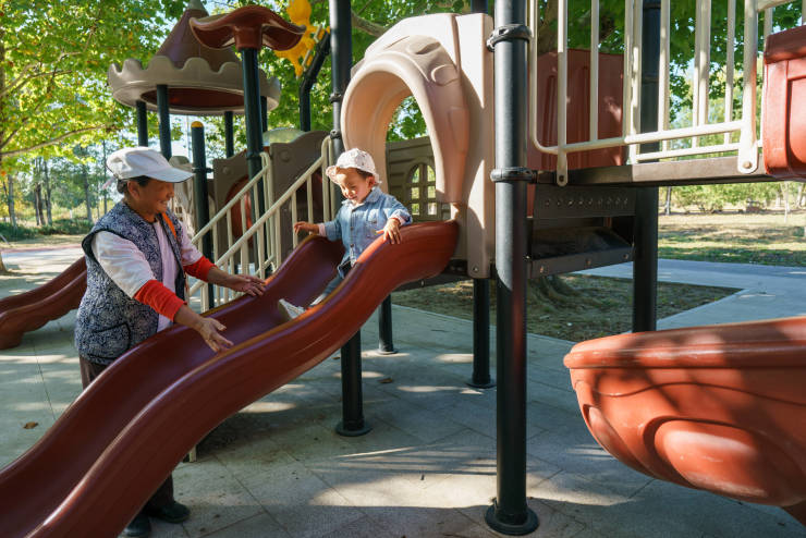 老人带着孩子在公园的儿童休闲乐园玩滑梯。新京报记者 王子诚 摄