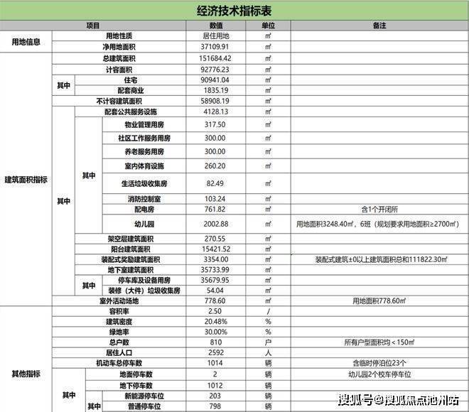 武汉招商关山序B地块规划净用地面积37109.91㎡,总建筑面积151684.42㎡。计容面积92776.23㎡,其中住宅90941.04㎡,配套商业1835.19㎡。不计容建筑面积58908.19㎡,配套公共服务设施4128.13㎡,物业管理用房317.50㎡,社区工作服务用房300.00㎡,养老服务用房300.00㎡,室内体育设施260.20㎡,6班幼儿园建筑面积2002.88㎡(用地面积3248.40㎡)。架空层建筑面积270.55㎡,阳台建筑面积15421.52㎡,装配式奖励建筑面积3354.00㎡,地下室建筑面积35733.99㎡。室外活动场地778.60㎡,容积率2.50,建筑密度20.48%,绿地率30.00%,总户数810户,居住人口2592人。机动车总停车位1014个(含新能源停车位203个),非机动车总停车位556个(含电动车自行车停车位279个)。