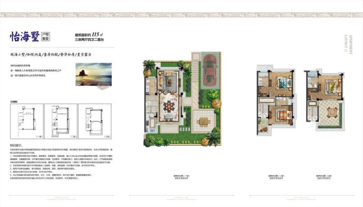 建筑面积约115㎡户型为三房两厅四卫双露台,对于一家三代同堂的家庭来说,已是足够,而开门即见入户庭院,把花朵和美景的概念引入家中,更具灵动美感。