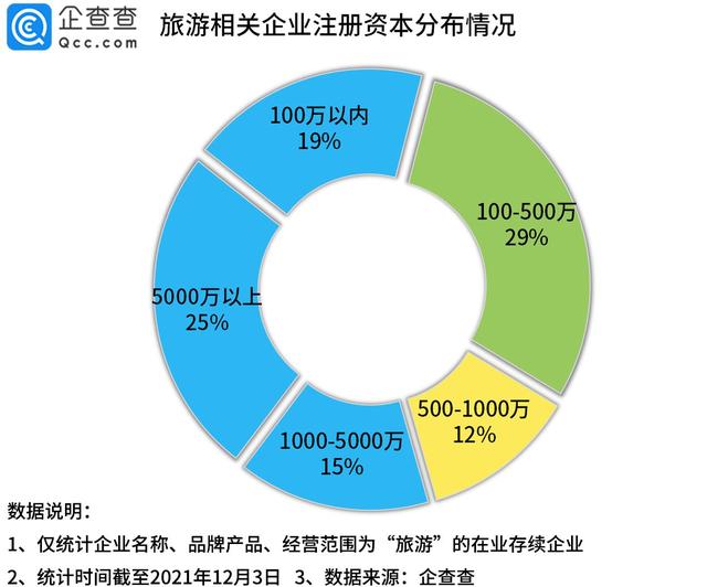 从注册资本分布来看,企查查数据显示,我国旅游相关企业注册资本主要分布在500万以内,占据了总量的48%,其中19%的企业注册资本在100万以内,29%的企业注册资本在100-500万这个区间;而注册资本在5000万以上的则占25%。
