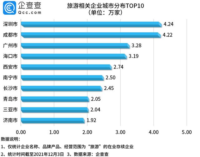 企查查数据显示,深圳市旅游相关企业数量最多的,达4.24万家,占据了广东省总量的32%。成都市、广州市分别以4.22万家和3.28万家位列二三位。