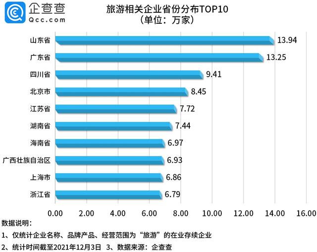企查查数据显示,山东省旅游企业数量最多,拥有13.94万余家相关企业,先进于全国其他省份,占据了全国总量的9%。广东省、四川省分别以13.25万家和9.41万家排名二三位。