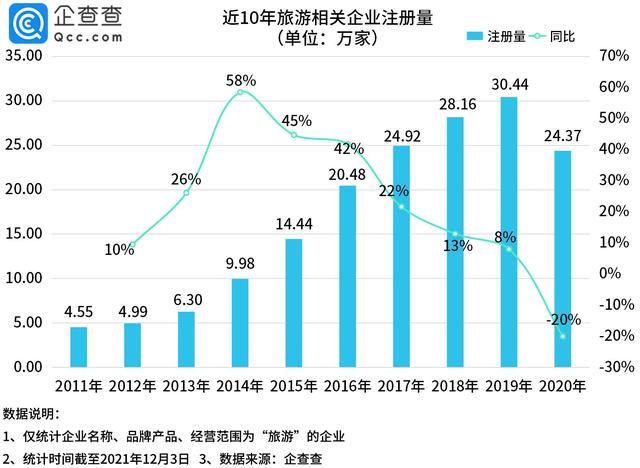 企查查数据显示,2011-2019年我国旅游相关企业年注册量逐年攀升,2014年注册量近10万家,同比增长58%,达到近年来增速峰值。2019年注册量达30.44万家,为历年来较高同比增长8%。2020年注册量略有下降,共新增注册量24.37万家,同比下降20%。2021年前11个月共新增近24万家相关企业,同比增长10%。