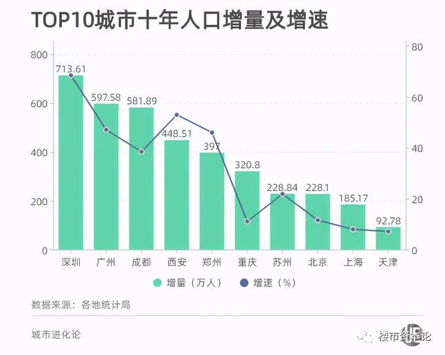 广州、深圳超越天津,分列第五、第六位,值得一提的是,二者过去十年的人口增量分别达到597.58万和713.61万;