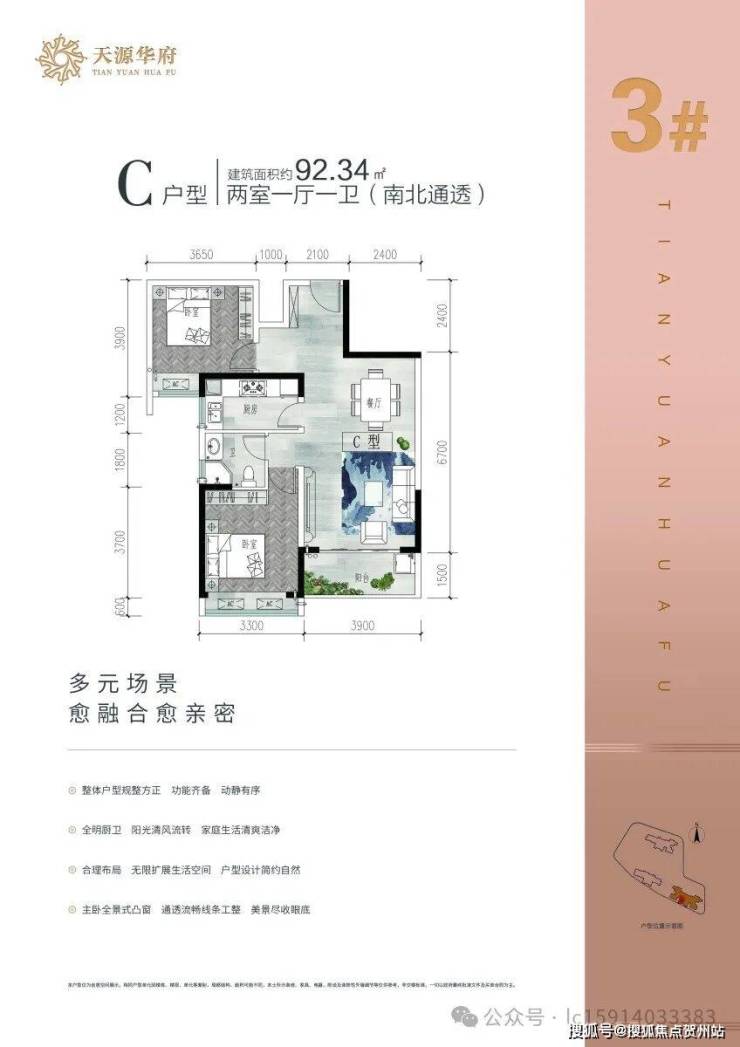 2.天源华府主要卖点是中山公园大景观,户型方正,功能分布科学合理。部分户型多方向开窗,室内自然光线充足,整体尺度配置较高,配合低容积率和高车位比,属舒适型居住产品。主力户型的2-3房,公园景观资源有限,一线视野由大户型占有。