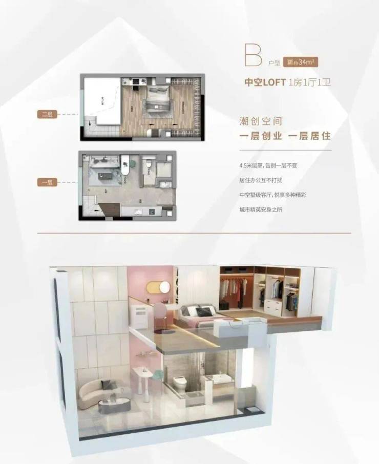 户型:33-58㎡,4.5米层高的 LOFT一房一厅户型,可实现一层办公一层居住。