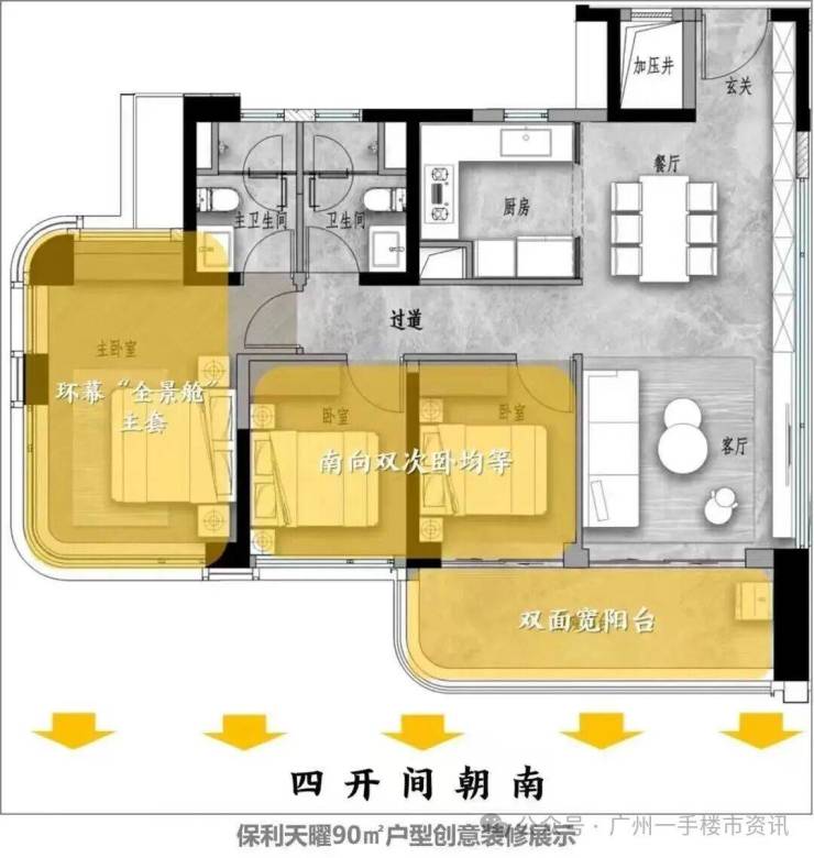 保利天曜项目90㎡三房户型仅有两条梯腿可选,90㎡户型分为正南向三房和东南向三房,B1栋的90㎡三房是整个小区面积最小楼间距最宽的户型,高层东南向还可以远眺江景、琶洲和金融城的城市景观。