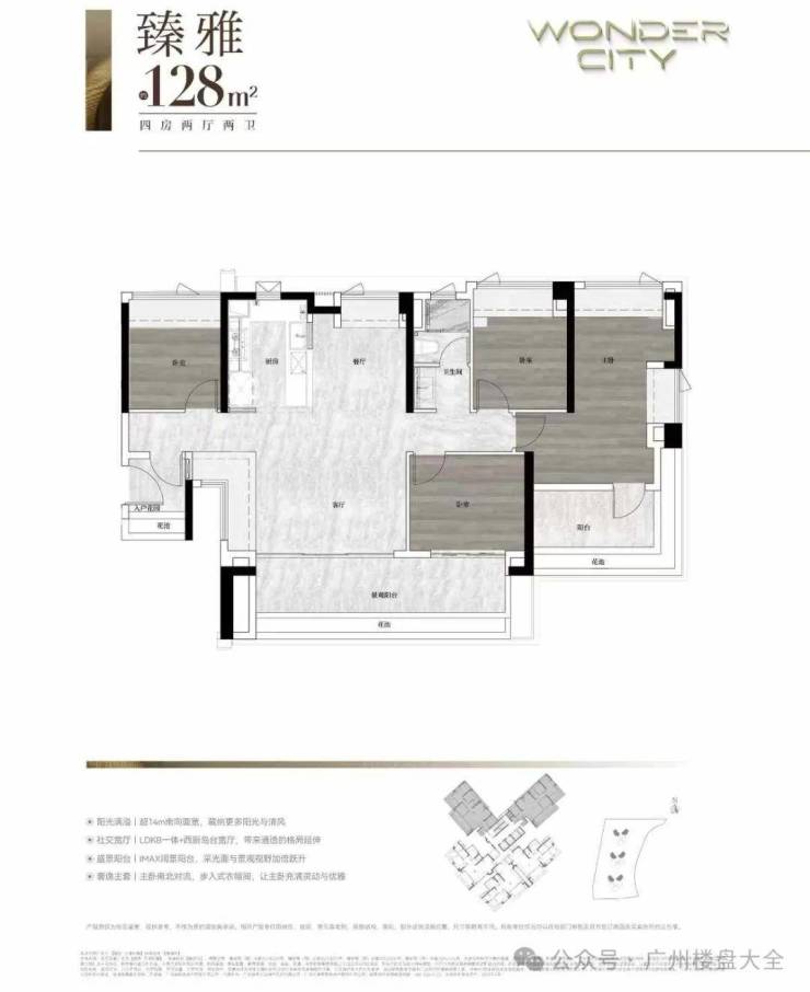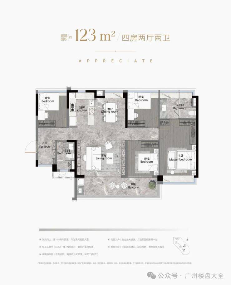 建面123平四房两卫,南北对流户型,LDKB一体化设计,约7米长景观阳台,主卧设置L型衣帽间,三个次卧差不多大小,转角玄关用作收纳。总价:560-650万左右。