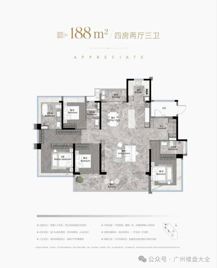 建面188平四房三卫,据说使用率超110%,双主套分居两侧,三代同堂的话,可以很好地避免两代人不同的休息时间干扰互相,入户独立玄关为还有宽裕的储蓄空间,能安置酒柜等,更有南北对流双阳台+中西双厨,主卧超宽三面采光等,不愧是终极改善不二之选,9米长跑道阳台,约34平豪华主卧,270度环幕飘窗。总价970-1100万左右。