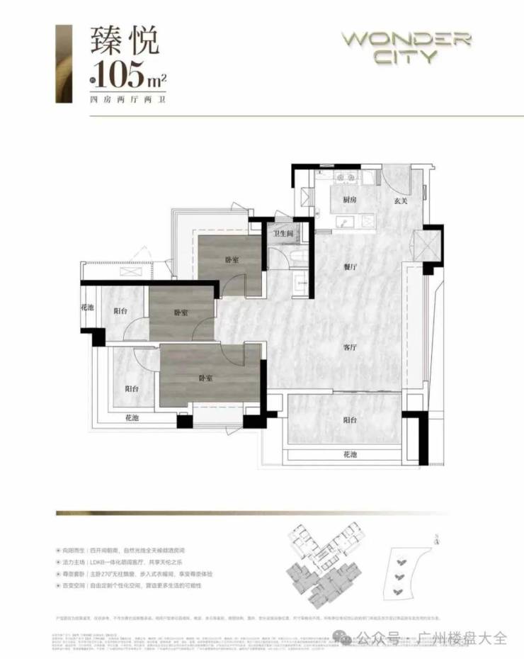 105平四房两卫户型是竖厅布局,使用率大概在128%左右,这个户型最大的亮点是三个次卧都能三边下床,跟市面上大部分次卧的床只能铺在飘窗上的项目对比,空间阔绰很多。西南向总价460-500万左右,东南向望花园总价420-470万左右。