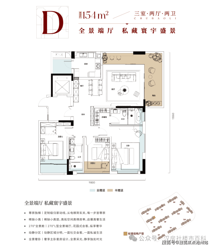 该户型位于2 号楼及 11 号楼,有独立的入户电梯厅,三开间朝南,西南面开间约10.5米,三个卧室均带全尺寸飘窗,100m²左右的功能性三房,适合刚需家庭。