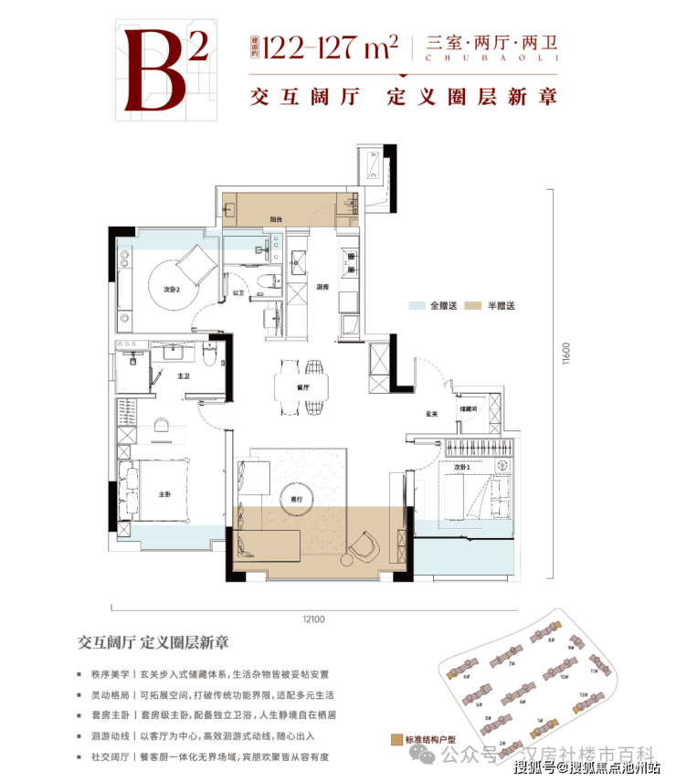 该户型位于1、6、8号楼及 12 号楼的边户,有独立的入户电梯厅,三开间朝南,入户门口新增了一个小型储物空间,且南北双阳台布局,增加了房间的通透性,全屋赠送面积很大,120m²左右可以满足刚需改善型的需求。