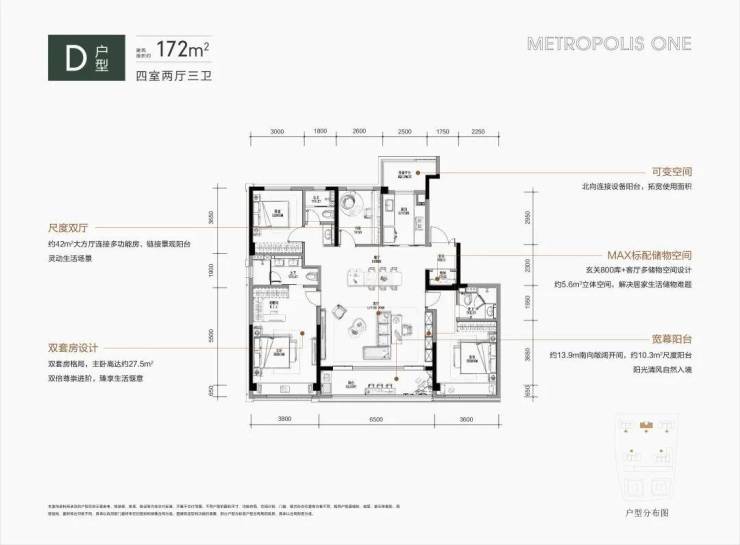 约172平方米的户型体现了生活的极致表达,其配备宽敞的大厅和跑道式阳台,四开间朝南和双套房的豪华设置使其在同类户型中突出。特别是厨房靠近客厅一侧的餐厅布局,使厨房成为家庭生活和社交的中心。