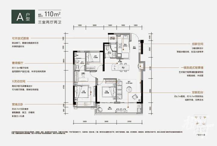 约110平方米的户型通过动静分区的设计理念确保了生活的有序,三个朝南的开间和阳台设计保证了优越的采光,每缕阳光都能照亮家中每个角落。同时,两个卫生间的设置有效解决了家庭成员早间排队的问题。