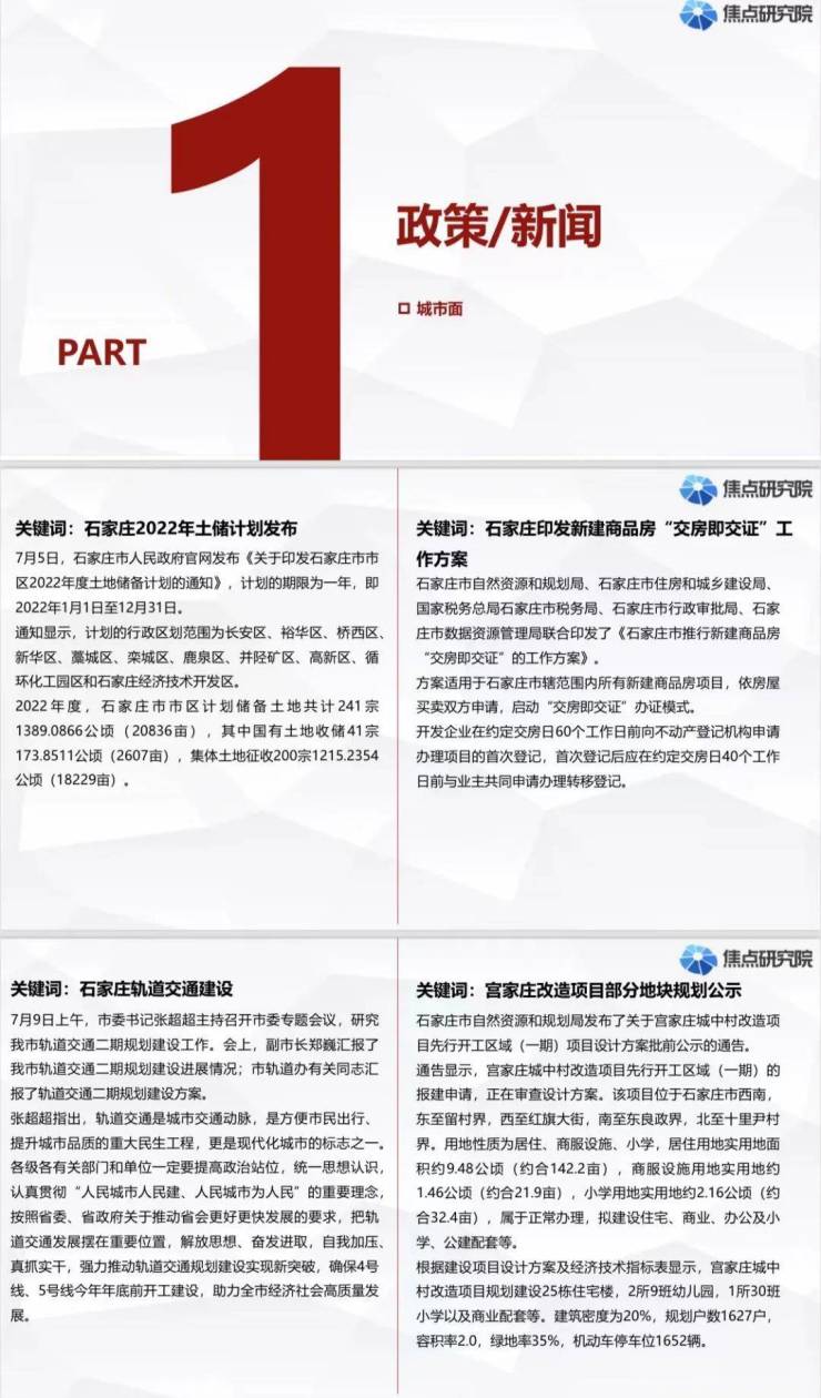 焦点研究院石家庄房地产市场周报告报告时间:2022年7月4日至7月10日出品时间:2022年7月13日研究员:樊晓璐数据来源:回望研究机构市场聚焦(第27周)当周石家庄普通住宅供应面积6.53万平方米,环比上…