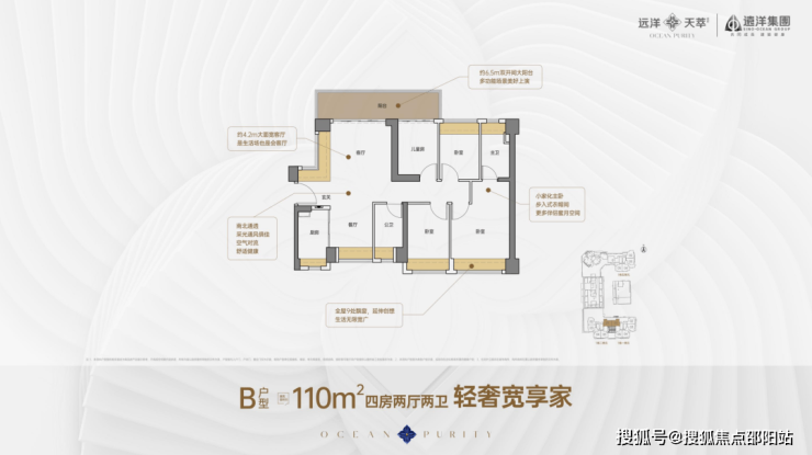 对尺度感要求更高的,可以选择约110㎡4房,南北通透的设计,实现了5开间朝南。
