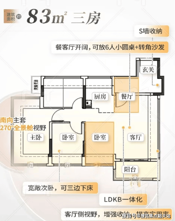约83㎡南向三房两卫:单边位设计,套内空间更优,次卧可实现三边下床,居住尺度远超同面积段产品;