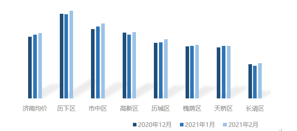 图:贝壳找房统计-2020年12-2021年2月济南各城区二手房均价变化