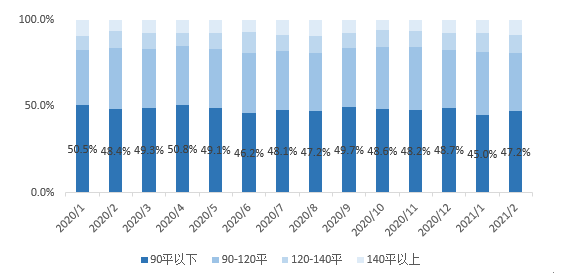 刚需购房占市场主力。从成交结构来看,90平以下二手房源成交占比为47.2%,环比2021年1月增长2.2%。值得注意的是,140平以上四居室改善型房源成交环比2021年1月提升0.7%,同比2020年2月提升2.1%,成交量处于2020年以来较高位上。