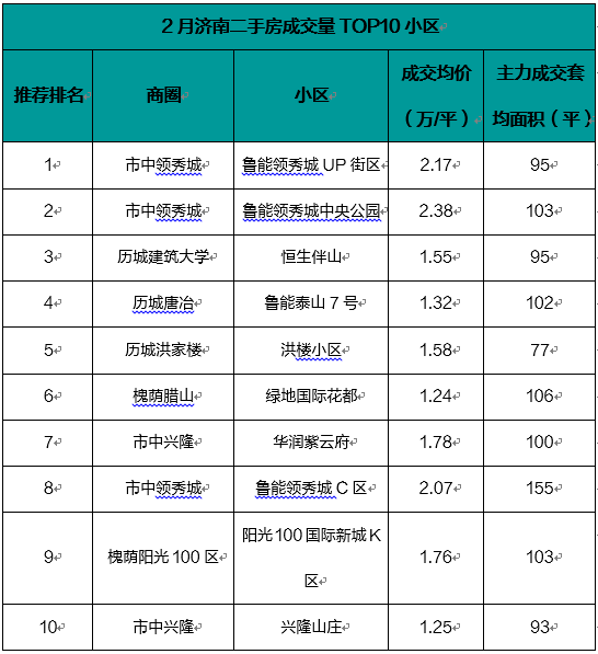 2021年2月排在贝壳找房平台成交量首位的是市中领秀城商圈的鲁能领秀城UP街区小区,小区成交均价为2.17万元/平方米,主力成交套均面积为95平方米。