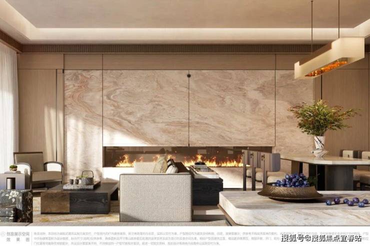 在室内,客厅背景墙使用了罗马假日天然石材,营造出含蓄高级的氛围,立体层次感非常强。