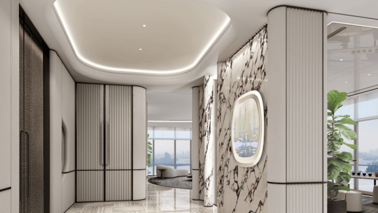 独门独户的大尺度电梯厅,市场罕见的双电梯入户、主仆双动线。保证私密性的同时,也为业主入户、商务待客,营造尊崇感。