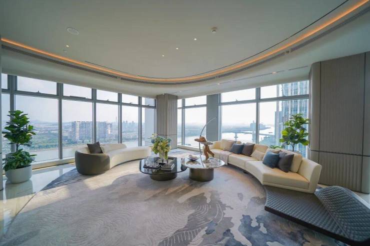 刷新广州平层产品天花板的约4.4-4.5米层高,更让整个空间在横向及纵向上都做到顶格的视觉张力。