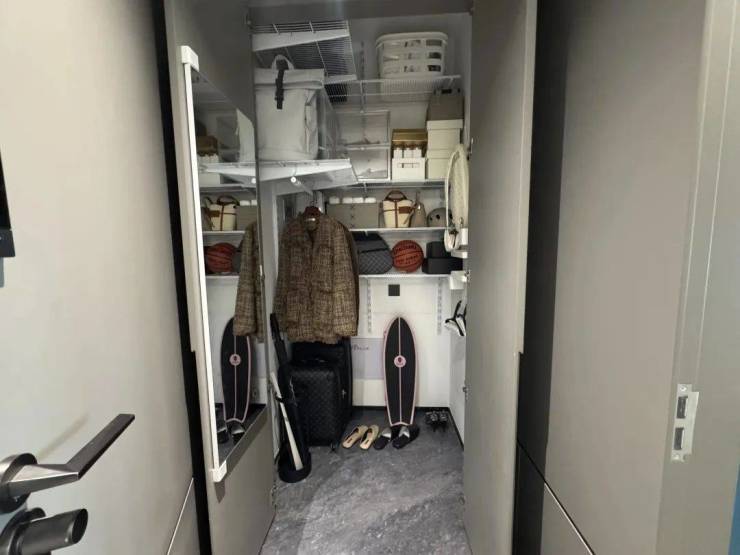进门后左手边是一个800库,连衣冠镜都有,内部可以按自己需求做隔断,行李箱、球拍、鞋子以及各种杂物尽可往里放。这在百平以内的小户型中并不常见,大多因为空间有限,通常都只打个玄关柜。