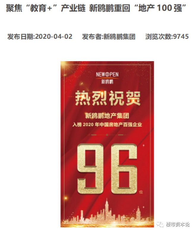 然而令人费解的是,去年4月,新鸥鹏官网却宣示,新鸥鹏地产集团在2020中国房企业500强测评中位列第96位,重回中国地产100强。