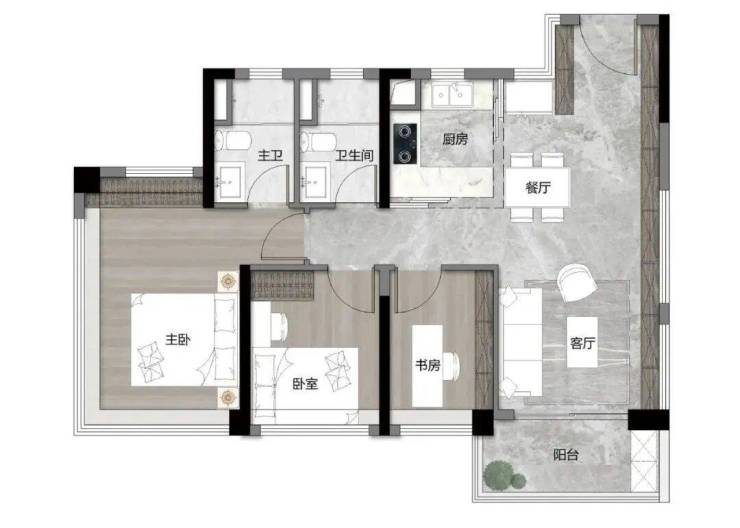 72㎡就做到三房两卫,四开间全南向,玄关位置可打造收纳柜,主卧是套房设计,带L型超大飘窗。