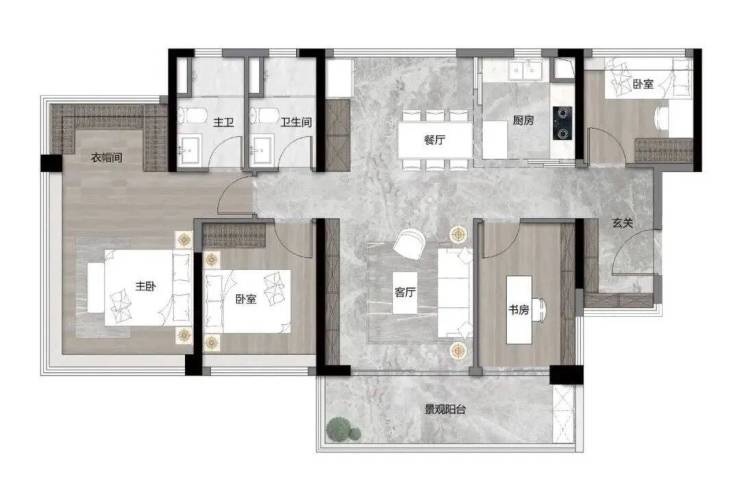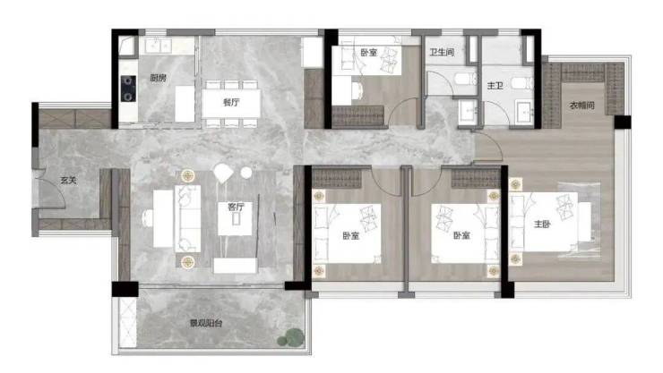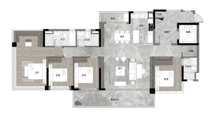 123㎡四房两卫,独立入户花园,南北对流,动静分区,厨房带岛台设计,客厅开间约5.8米连通大景观阳台,南向卧室空间都很大,主卧带衣帽间+270°大飘窗。