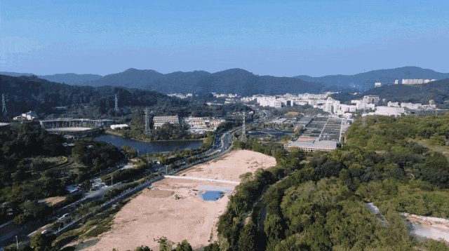 周边没有村屋,都是商业或者办公楼,或者山体和湖泊,道路宽敞,环境宜居。