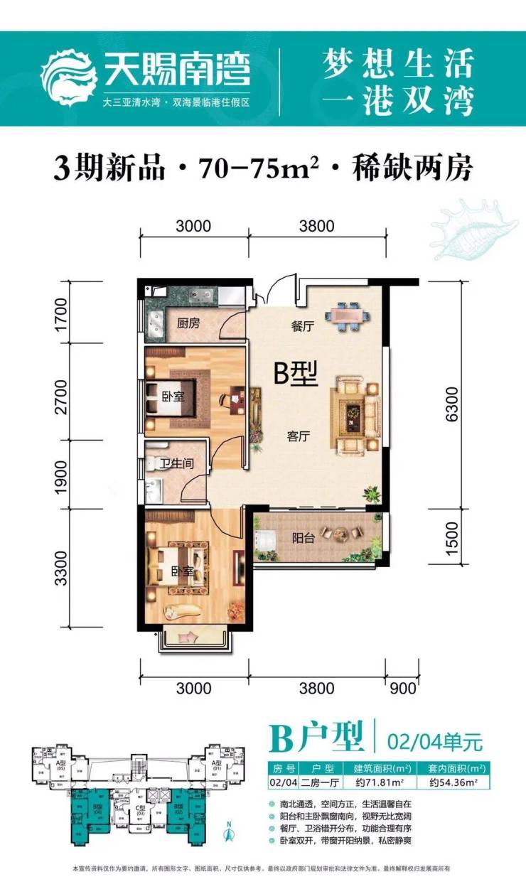 稀缺小户型:清水湾双海景,70年大产权,现房小户型!三期主力户型:约70-75㎡(两房)